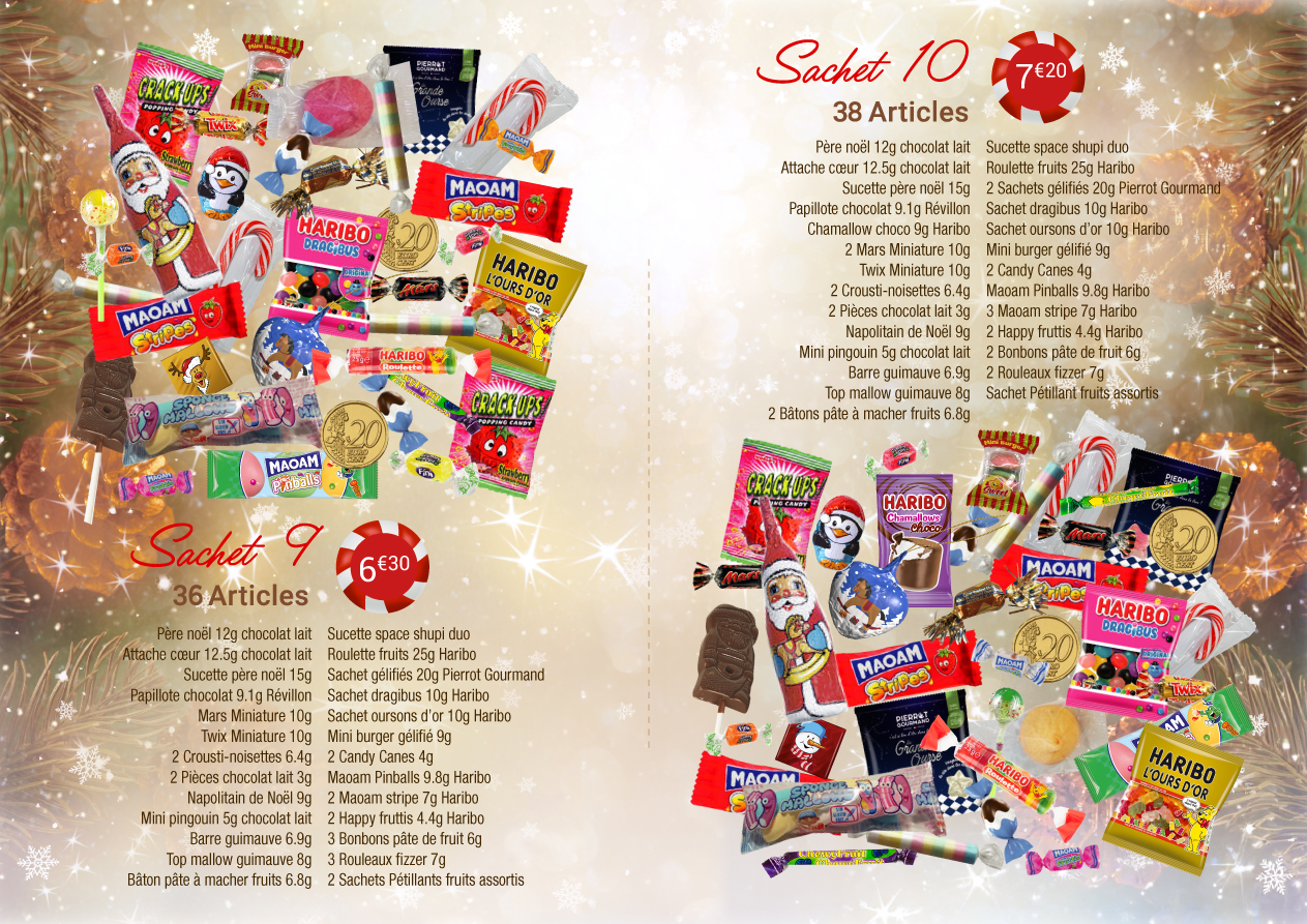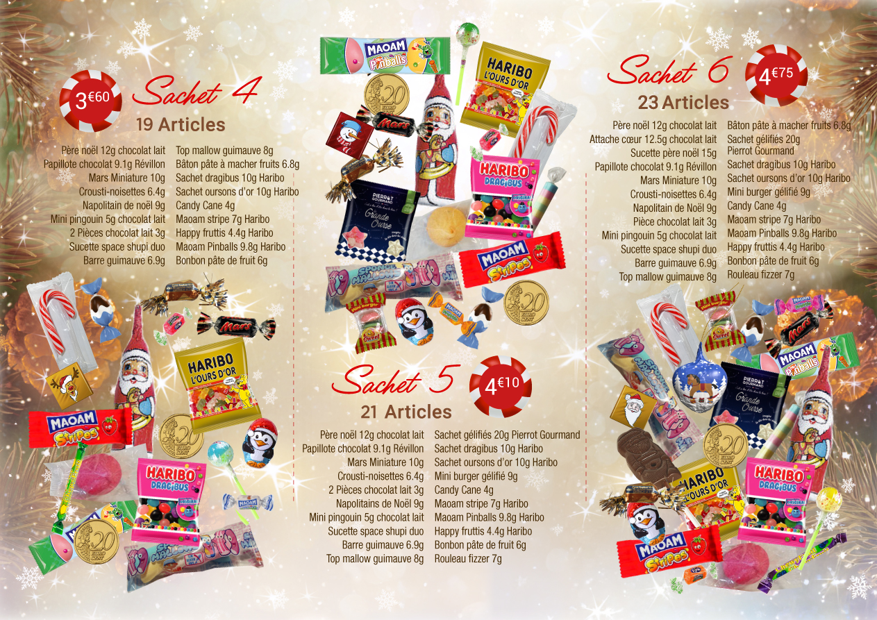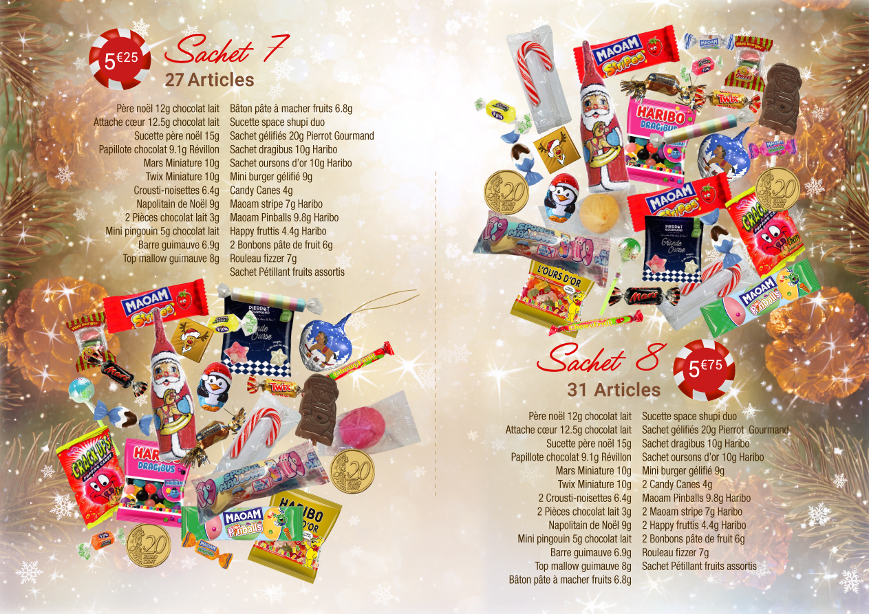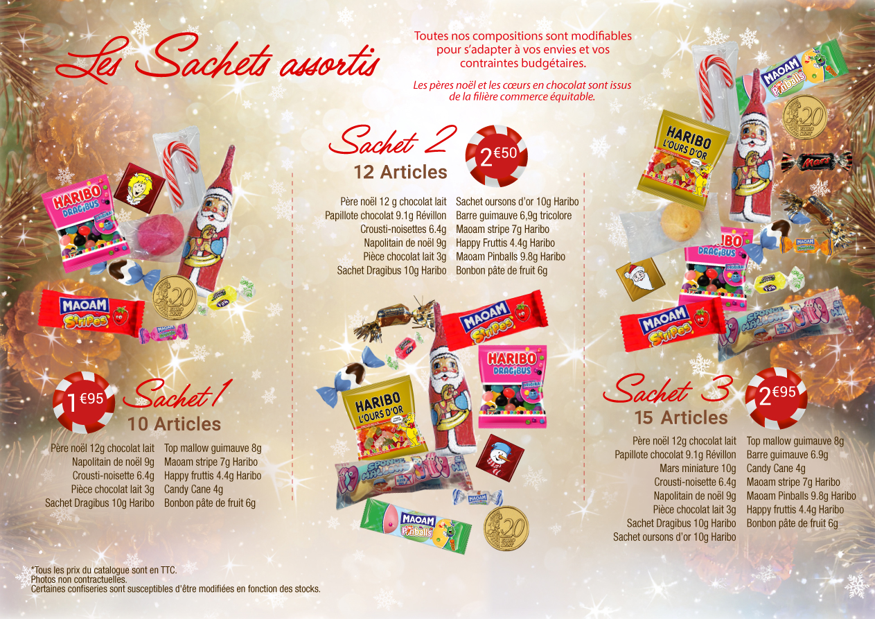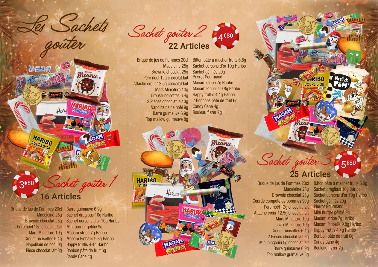 - vous découvrirez également 3 compositions spéciales « goûter » comprenant en plus des confiseries : une boisson un ou plusieurs gâteaux, une compote de fruits et des barres chocolatées